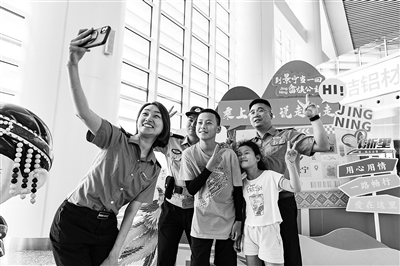 昨日,浙江省铁路丽水站内设置畲乡文化墙,车站工作人员帮助旅客拍照留念。