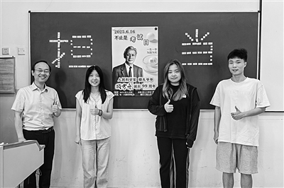 本次考试在两个考场同时进行。开考前,封毅拿出一卷纸筒,在黑板的考试座位图旁展开并贴上。那是一幅特别的人物海报,上面清晰地写着:“2025年6月16日,不只是考试日,还是人民科学家、糖丸爷爷顾方舟诞辰99周年。”
