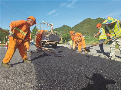 近日,开化县公路港航与运输管理中心的养护人员冒着酷暑,对城白线K24+800路段受损的沥青路面进行修补。连日的高温,却是沥青路面修补的黄金季节,一线公路养护人员顶着滚烫的沥青和烈日的双重炙烤,用汗水换来公路的平安顺畅。