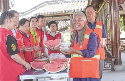 昨日,德清县洛舍镇残疾人之家开展“爱心清凉 情暖盛夏”公益活动,组织辖区残疾人和志愿者一起制作清凉汤,切配西瓜,并将这些清凉消暑食品送到环卫工人手中,营造和谐互助的社区氛围。