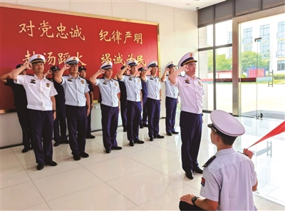 “我志愿加入中国共产党,拥护党的纲领,遵守党的章程……”在大队党委书记的领誓下,全体党员通过重温入党誓词,强化了“对党忠诚、纪律严明、赴汤蹈火、竭诚为民”的使命担当。王涛 文/摄